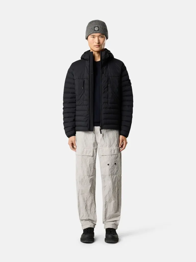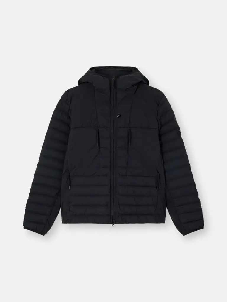 Daunenjacke aus einer einzigen Lage leichtem Stretch-Nylon mit nahtlosen Kammern für verbesserten Federhalt, mit gepolsterter Kapuze und unsichtbaren Reißverschlusstaschen. Mit Anti-Drop-Mittel gefärbt.