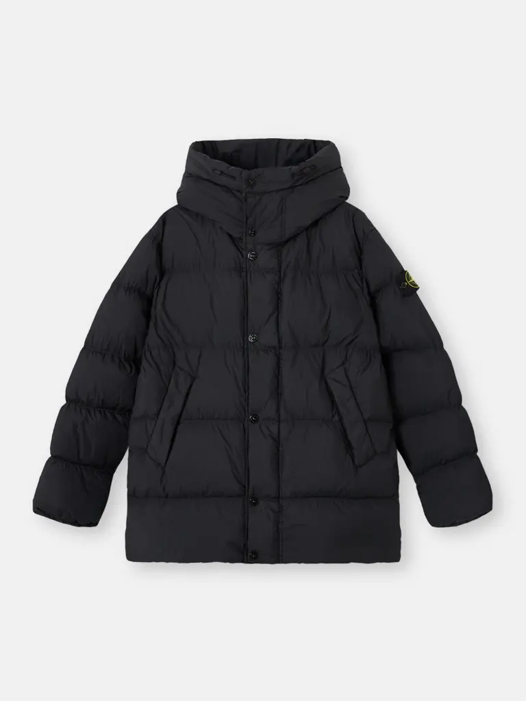 Kapuzenparka aus recyceltem Nylon-Rep, dessen innere Harzbeschichtung das Kleidungsstück windabweisend macht und ihm ein gekräuseltes Aussehen verleiht, mit mehreren Taschen, elastischen Bündchen und Zwei-Wege-Reißverschluss. Kapuzenparka aus leichtem recyceltem Nylon-Rep mit extrem dichter Webstruktur. Die Harzbeschichtung auf der Innenseite macht ihn windabweisend und leicht wasserabweisend. Durch die Harzbehandlung des Materials dringt die Farbe ungleichmäßig in das Material ein und verleiht der Oberfläche ein gekräuseltes Aussehen. Das Kleidungsstück ist mit feinsten Federn gefüttert, die speziell behandelt wurden, um dem Färbeprozess standzuhalten. RDS-zertifiziert (Responsible Down Standard).