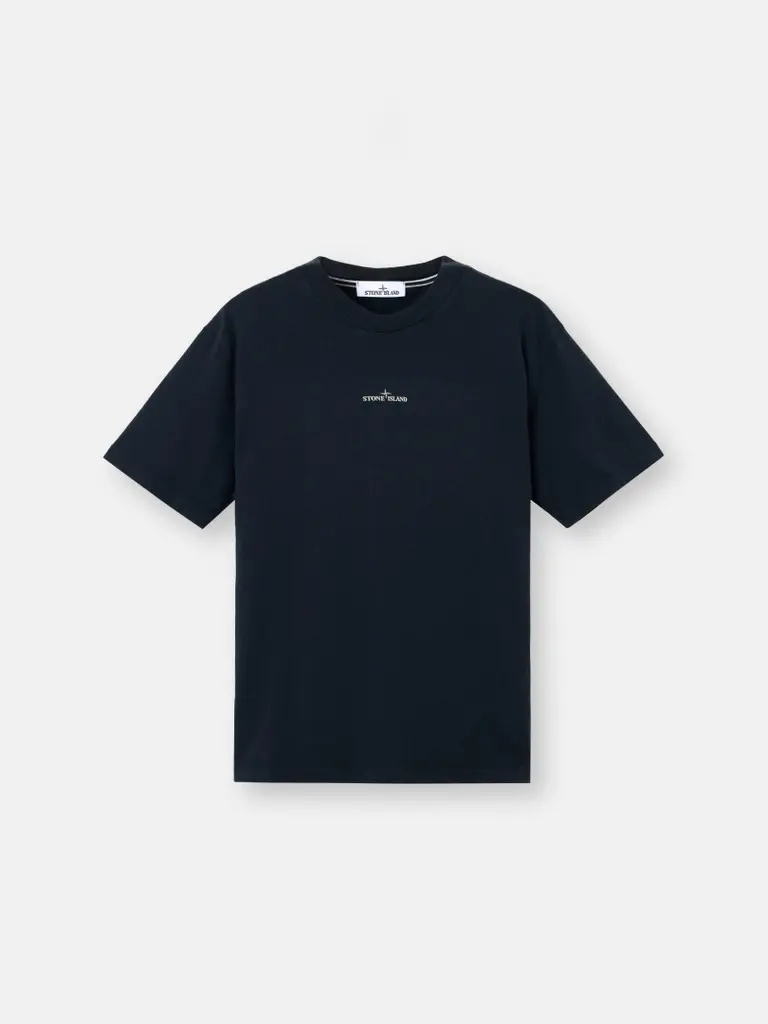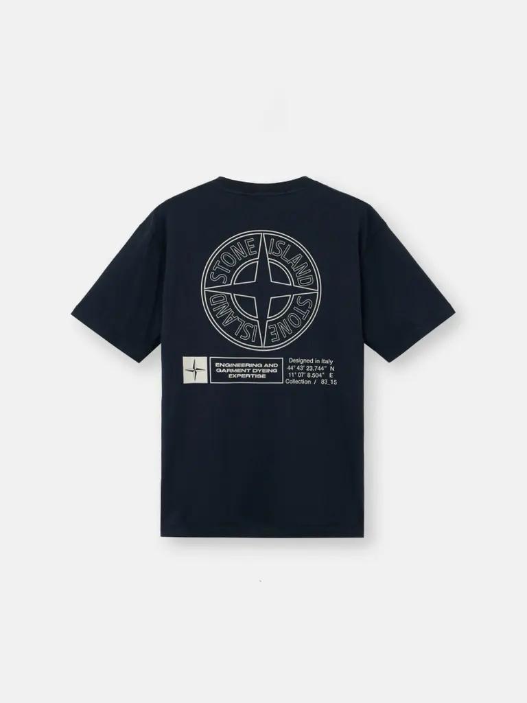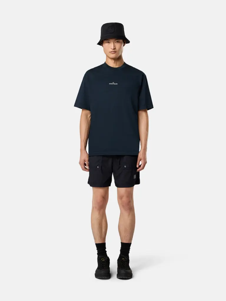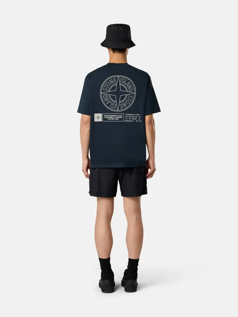 Kurzarm-T-Shirt aus gekämmtem Bio-Baumwolljersey mit Stone Island-Logo auf der Brust und Kompass-Logo auf dem Rücken. Stücksgefärbt. Kurzarm-T-Shirt aus gekämmtem Bio-Baumwolljersey mit „Industrial”-Print. Stücksgefärbt.